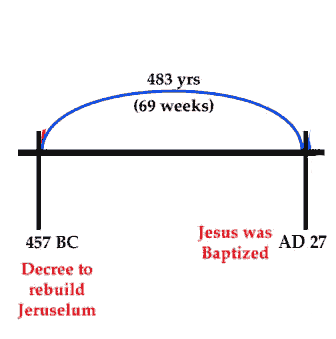 In Daniel 9:25 we find the Master Key to the entire prophecy. The angel gives us the beginning date for both the 490 years, which apply to the Jews, and the 2300 years. This brings us down to the Day of Judgment: "Know therefore and understand, that from the going forth of the command to restore and build Jerusalem. . . ." Here, then, with the command to restore Jerusalem, the prophecy begins. From Ezra 7, we may chronologically discover that Artaxerxes passed that decree in 457 B.C. From the decree to restore and build Jerusalem to Messiah the Prince was to be 69 weeks, or 483 prophetic days (7 x 69 = 483), which is 483 years. Since the decree went forth in the autumn, 483 years after 457 B.C. takes us to the autumn of 27 A.D.