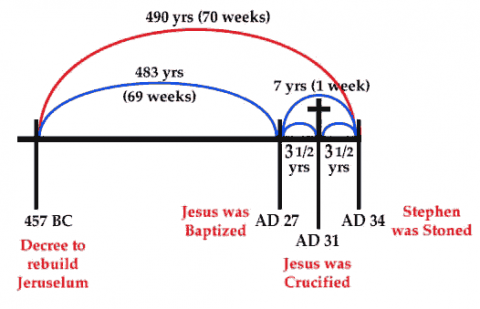 The 483-year prophecy, which ended with the anointing of the Messiah, brings us to the autumn of 27 A.D. But the prophecy includes one more prophetic week, or 7 years, for a total of 70 prophetic weeks. In the midst of this last prophetic week (31/2 prophetic days) the effective sacrifices of the Jewish sanctuary ceased and the Messiah was cut off.